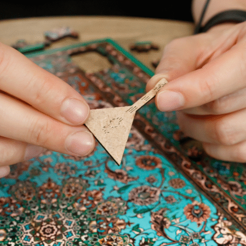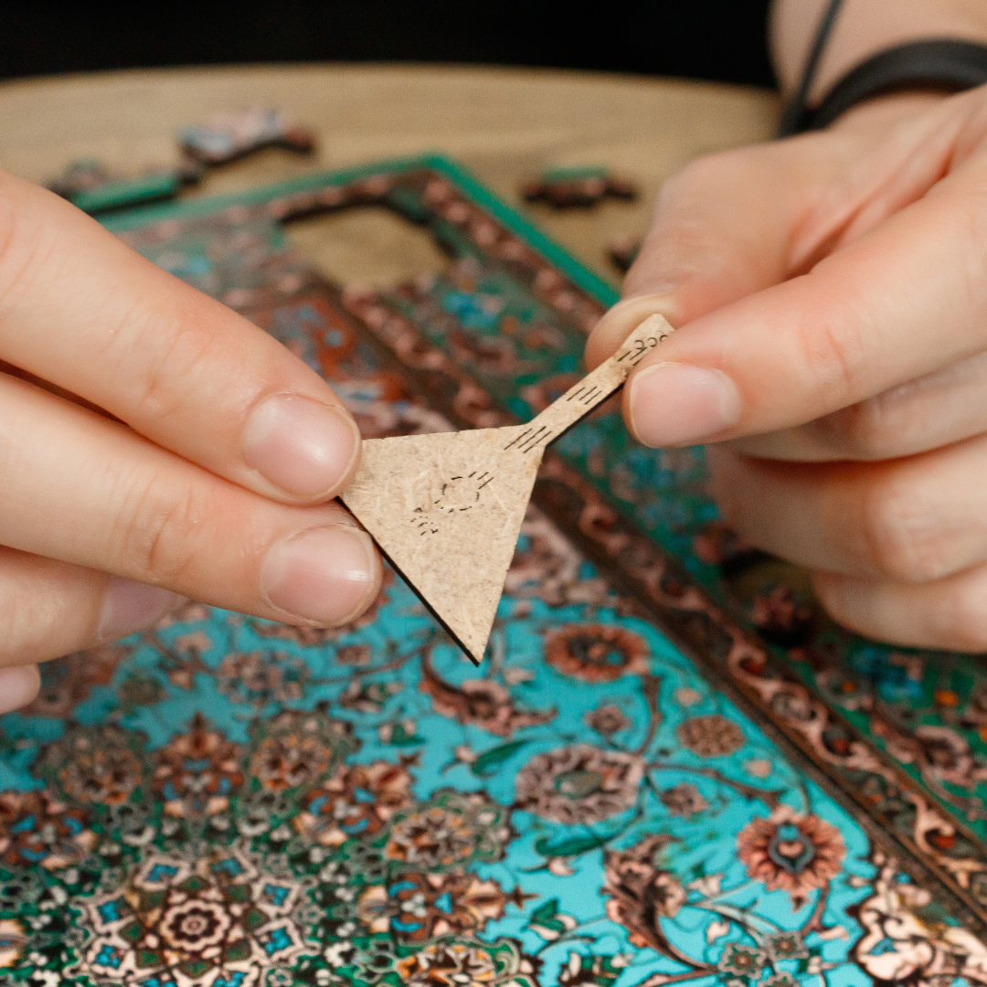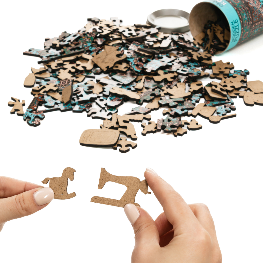 Это деревянный пазл на 250 деталей, выполненный в виде того самого ковра, который висел над кроватью почти в каждом доме в детстве. Детали пазла сделаны в форме домашней атрибутики XX века — радио, лампы, текстиля, блюдец и других предметов.
