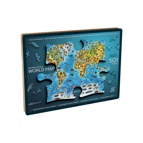 501 деталь из качественного МДФ превращаются в великолепную карту мира, которую можно повесить на стену после сборки. Это не просто деревянная головоломка — это увлекательное обучение географии и стильный интерьерный элемент.