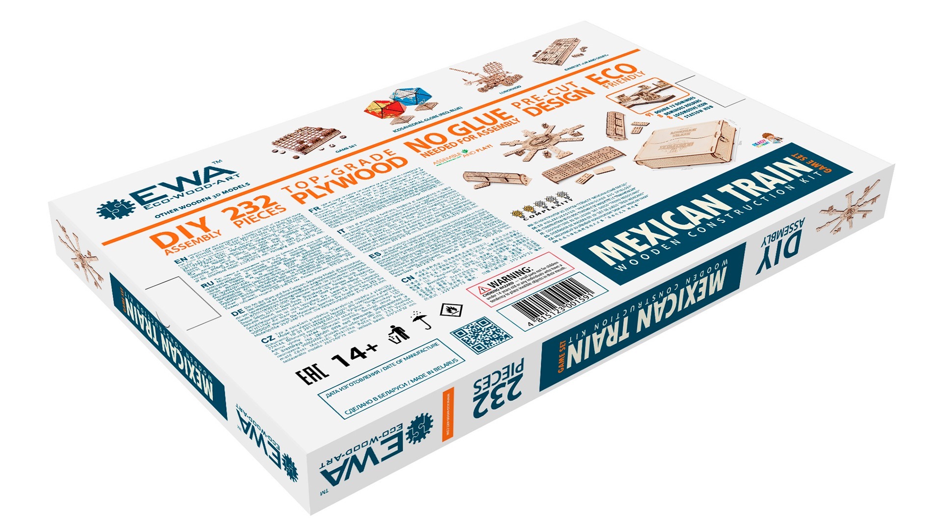 Mechanical 3D-puzzle of the domino game variation called Mexican Train. The kit includes: