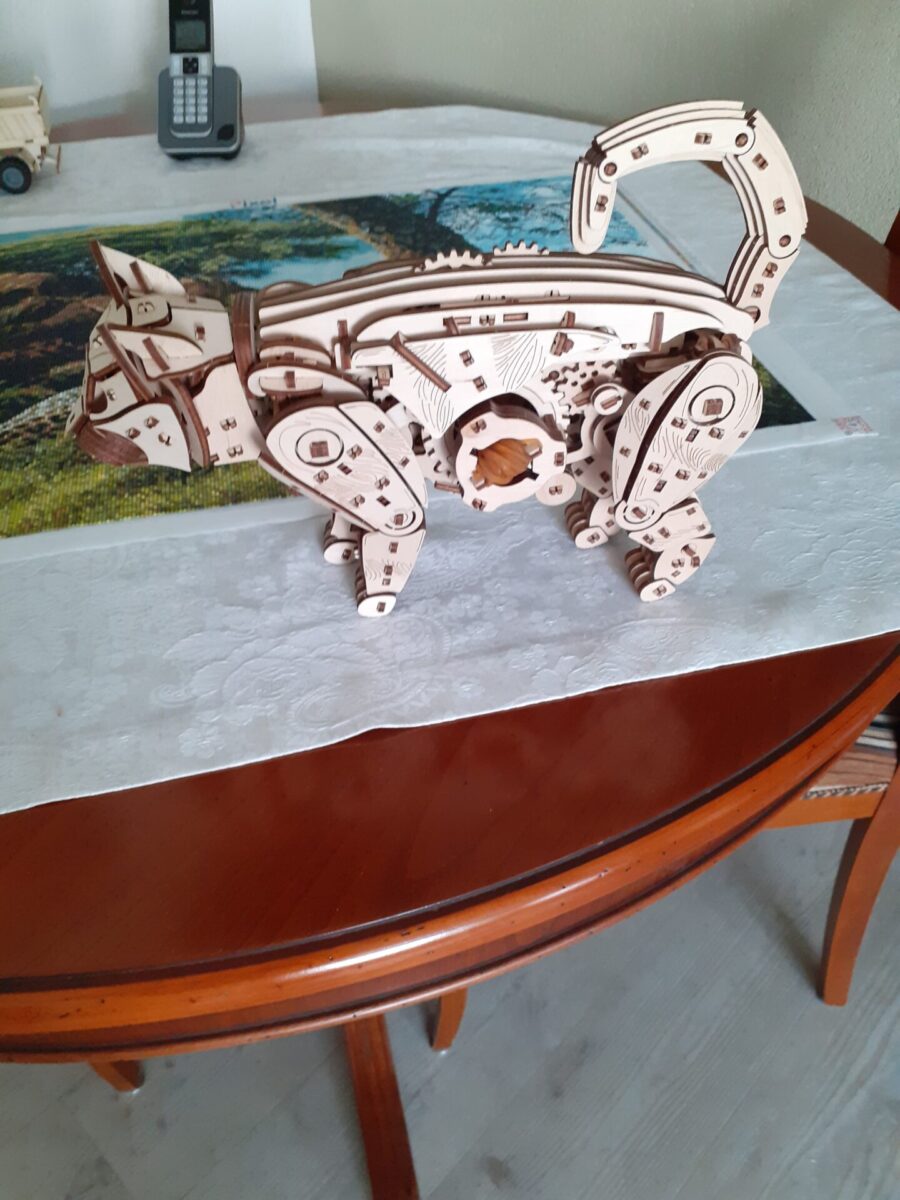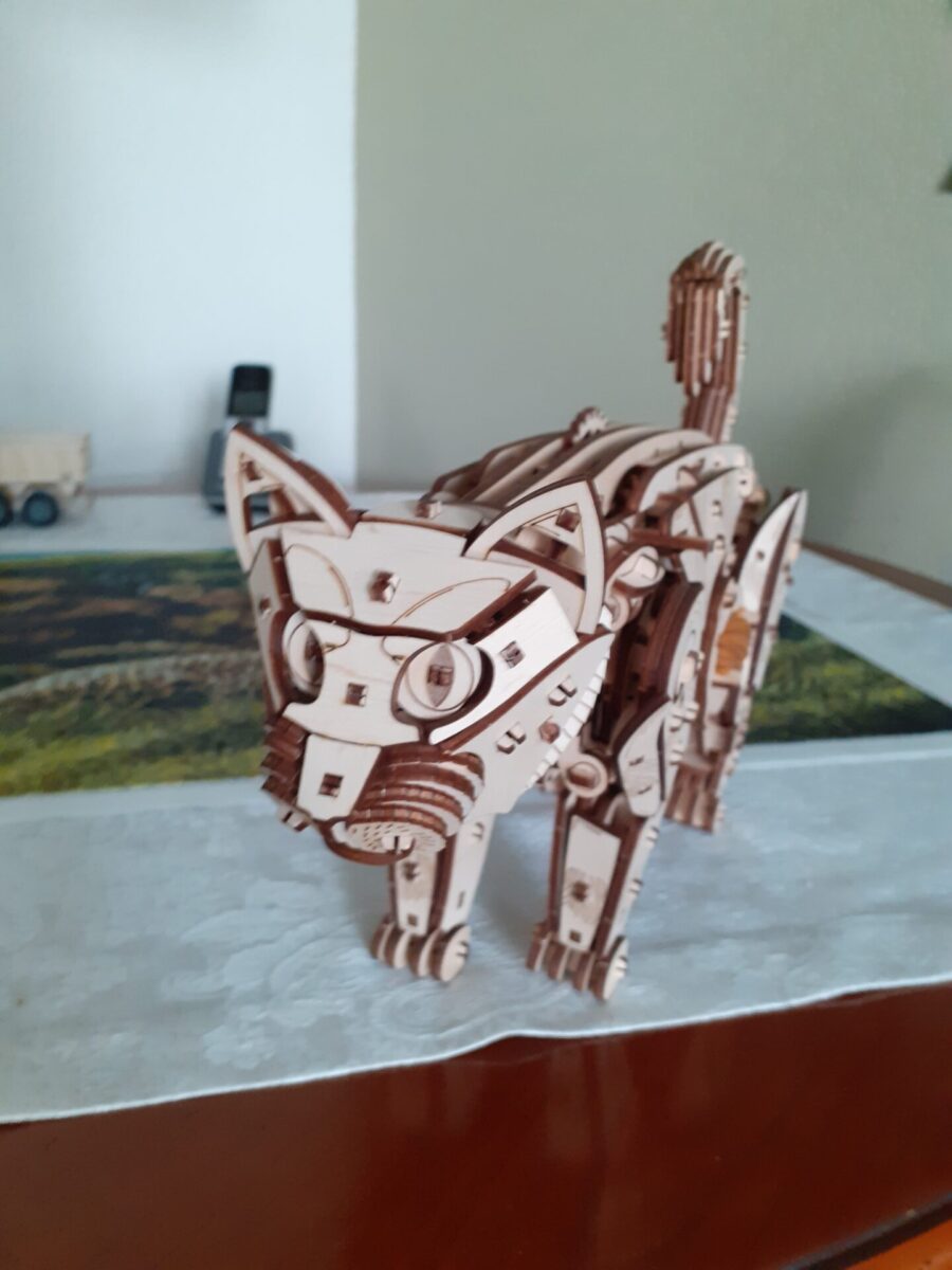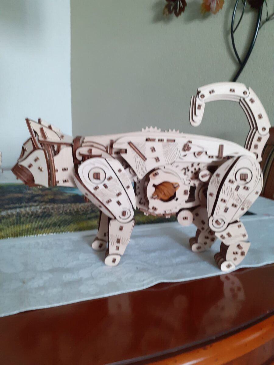 Mechanical 3D-puzzle of a walking cat. The model has rubber-band engine, start/stop mechanism and flexible tail.