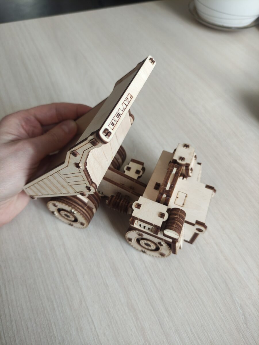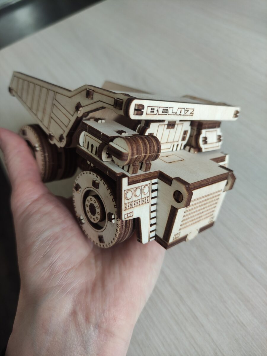 Механическая миниатюрная 3D-модель самого большого в мире самосвала. Предназначена для самостоятельной сборки. Простая сборка, экологически чистый материал, стильный дизайн, качественная прорисовка элементов и сходство с реально существующей техникой доставят  удовольствие как детям, так и взрослым в процессе сборки и последующего использования модели. Отличная игрушка, идеальный подарок и достойный предмет коллекционирования для дома и офиса! У модели откидывается кузов и открывается капот. Под капотом имеется небольшое отделение для мелочей.