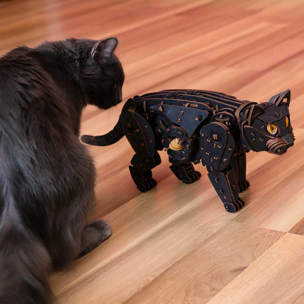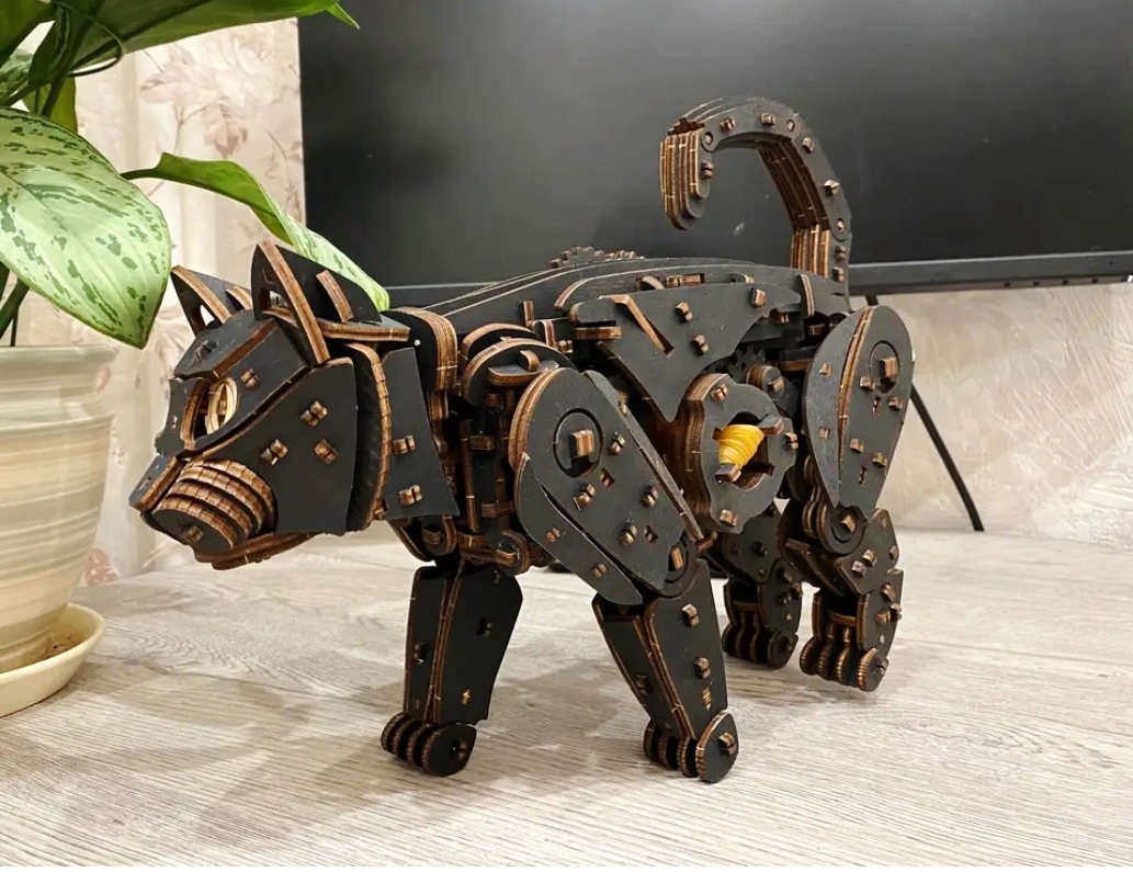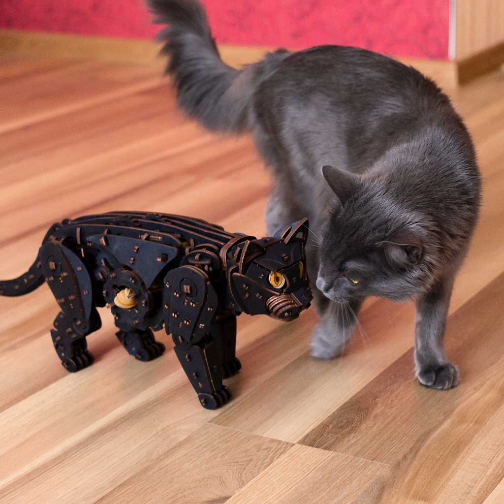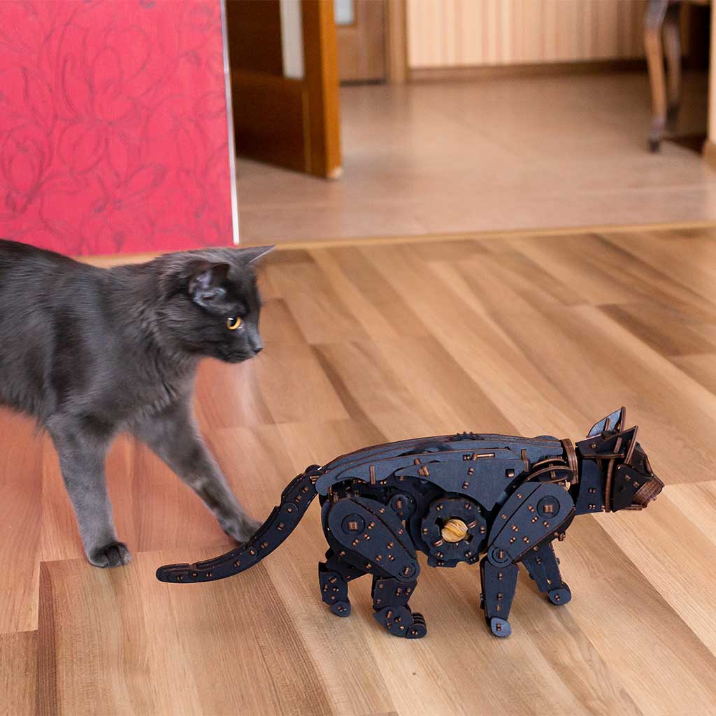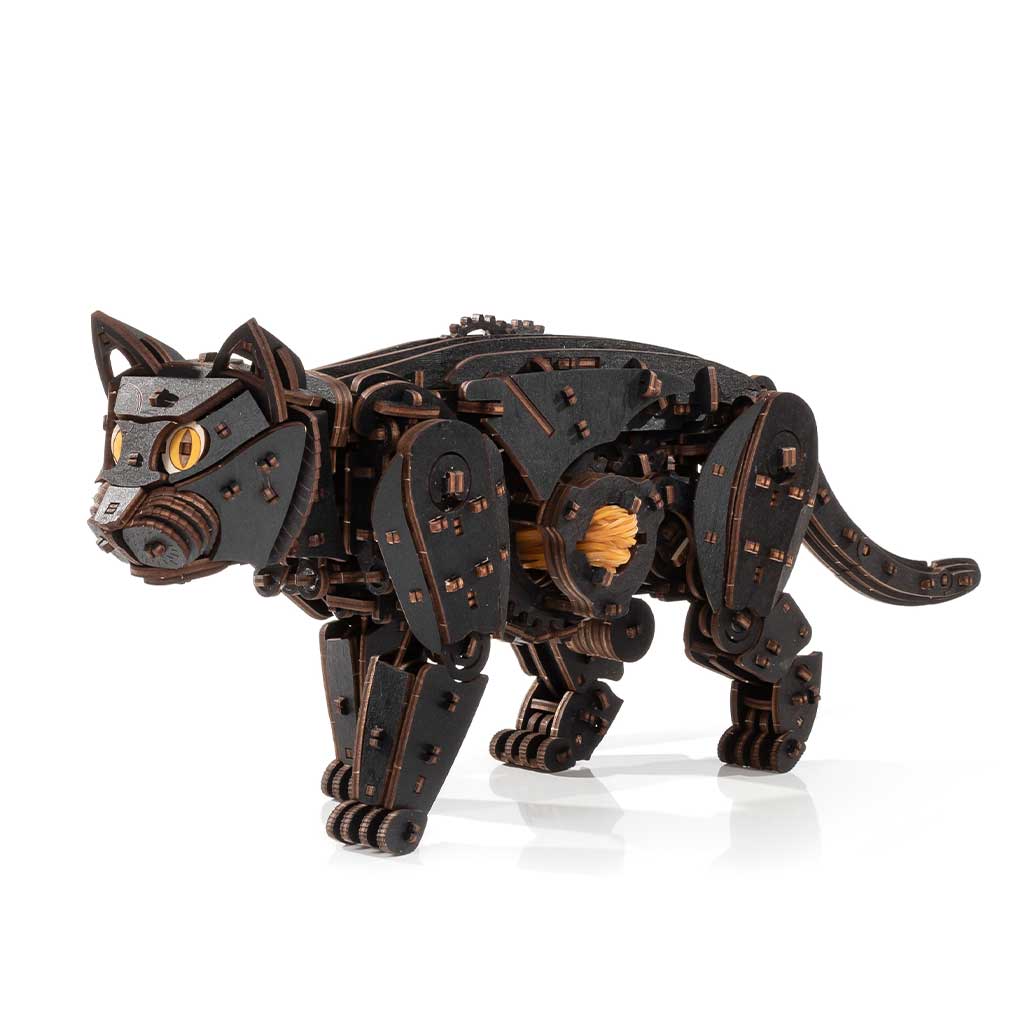 Механический 3D-пазл про ходячего кота. Модель имеет двигатель на резиновой ленте, механизм старт/стоп и гибкий хвост.