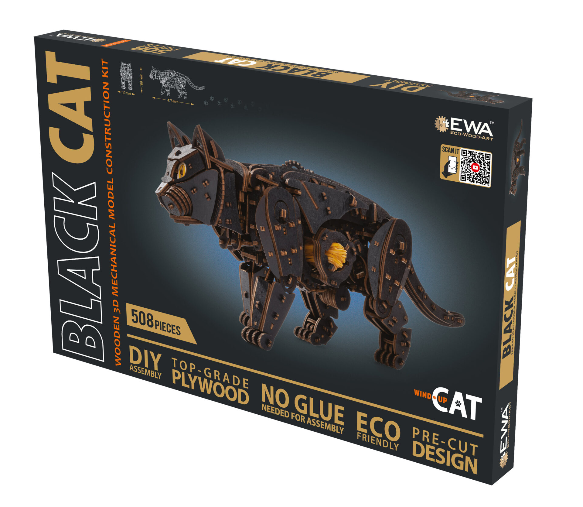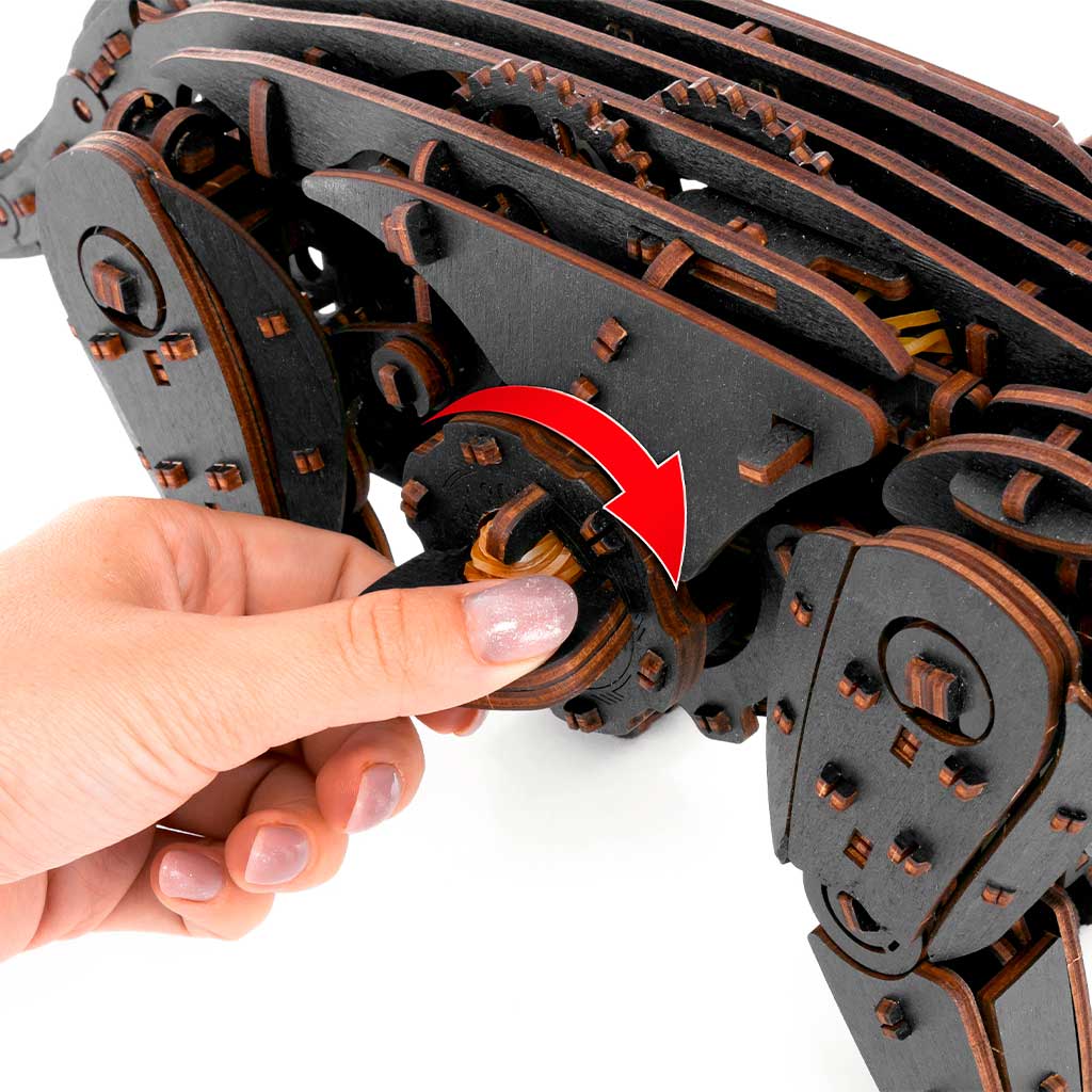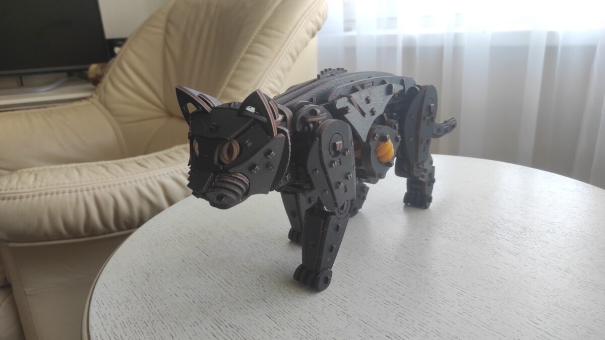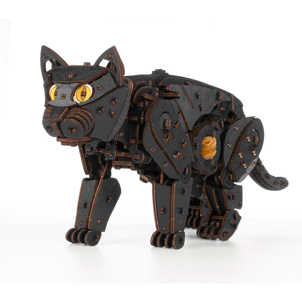 Механический 3D-пазл про ходячего кота. Модель имеет двигатель на резиновой ленте, механизм старт/стоп и гибкий хвост.