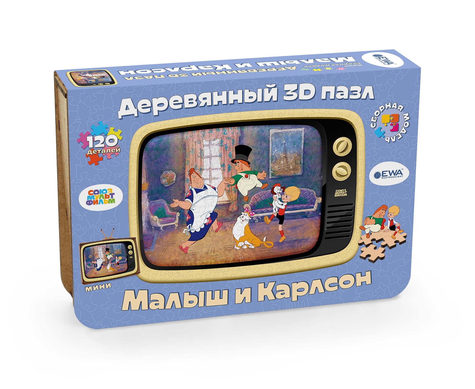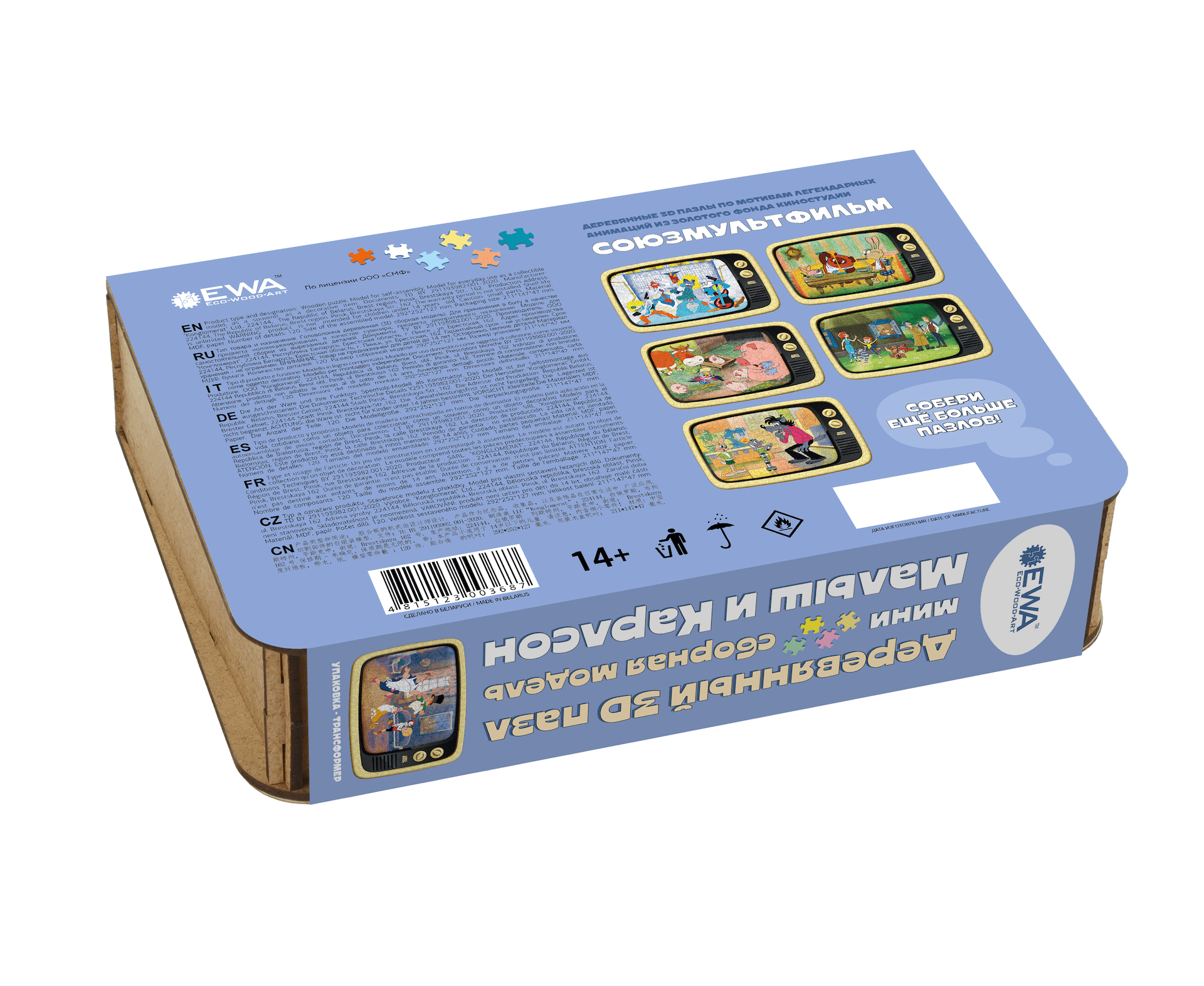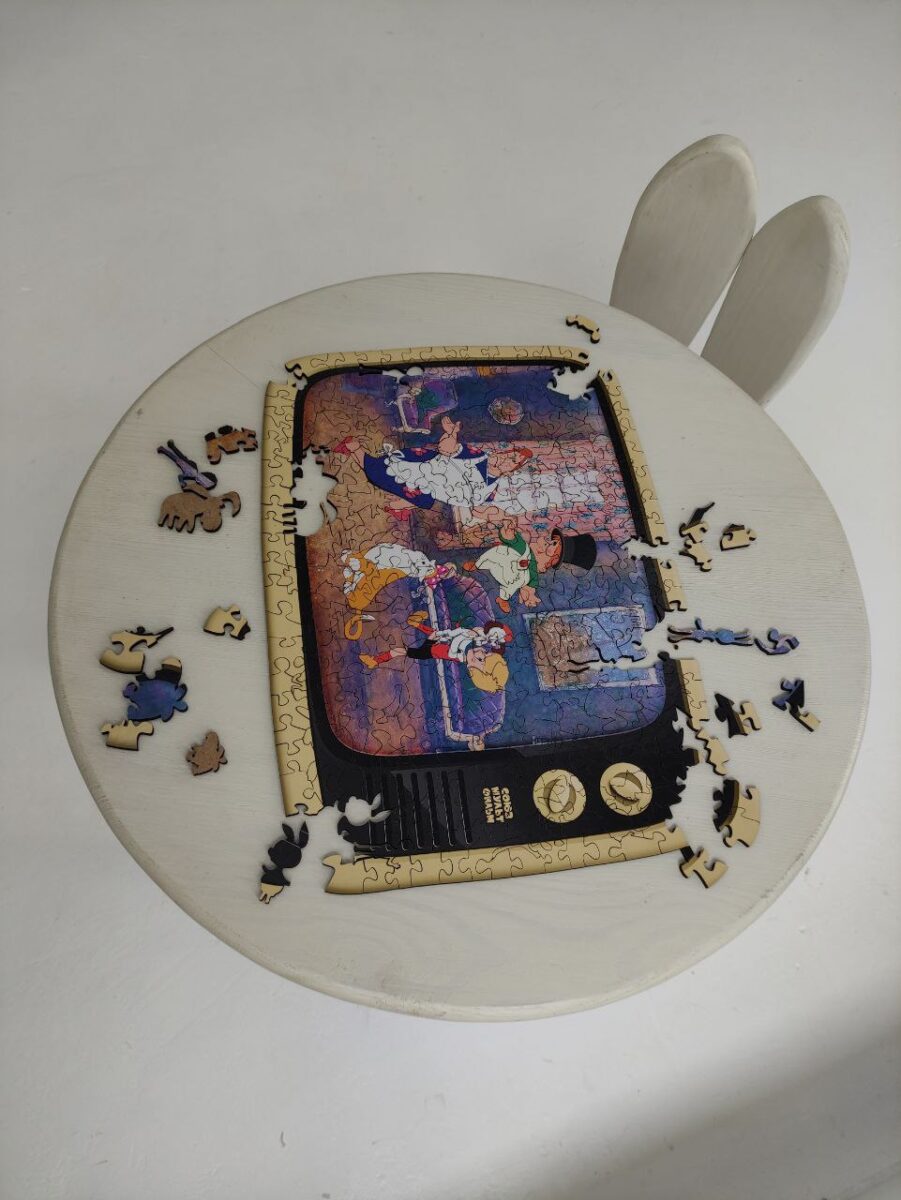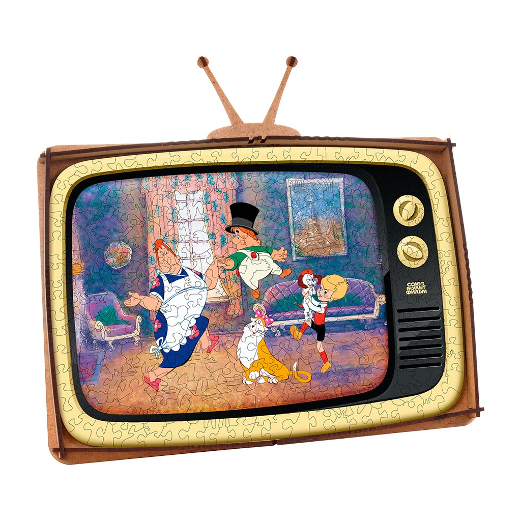 А главной фишкой этого пазла является его коробка, которая трансформируется в подставку для пазла в виде ретро телевизора. Деревянный пазл станет прекрасным подарком для всех любителей мультфильмов Союзмультфильма и для тех, кто хочет сохранить и передать своим детям частичку своего детства.
