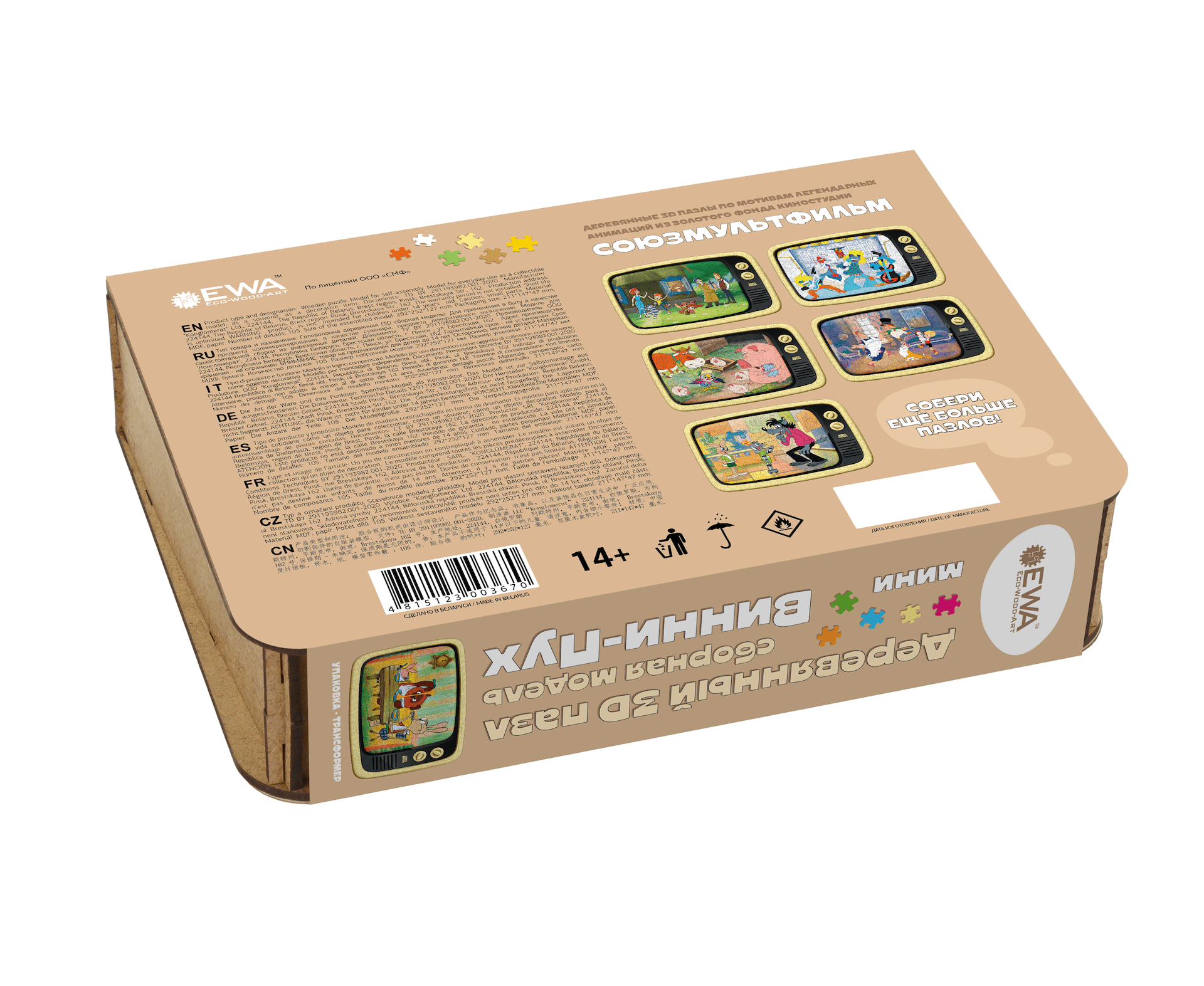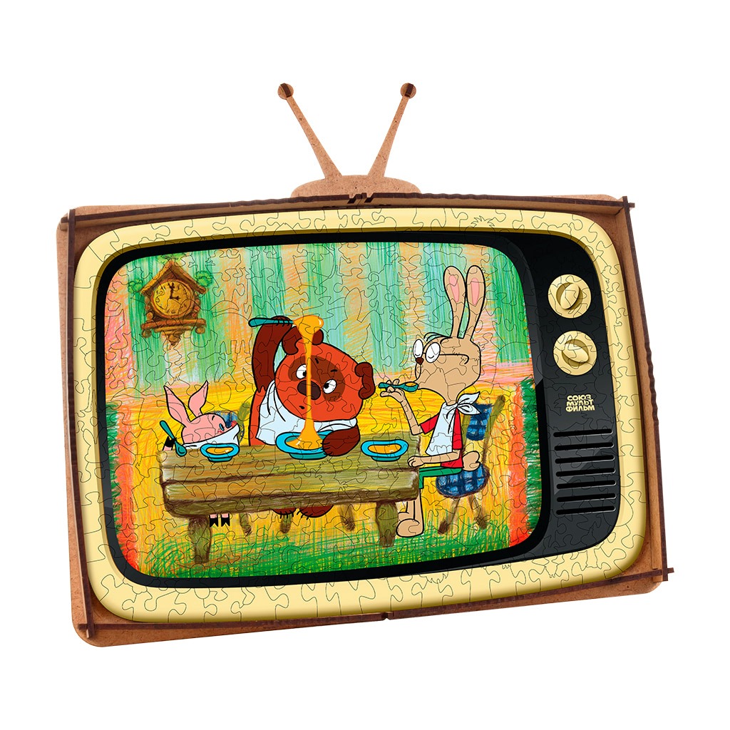 А главной фишкой этого пазла является его коробка, которая трансформируется в подставку для пазла в виде ретро телевизора. Деревянный пазл станет прекрасным подарком для всех любителей мультфильмов Союзмультфильма и для тех, кто хочет сохранить и передать своим детям частичку своего детства.