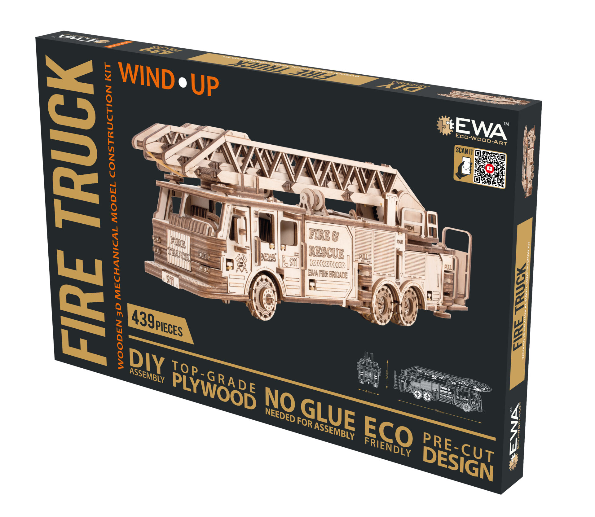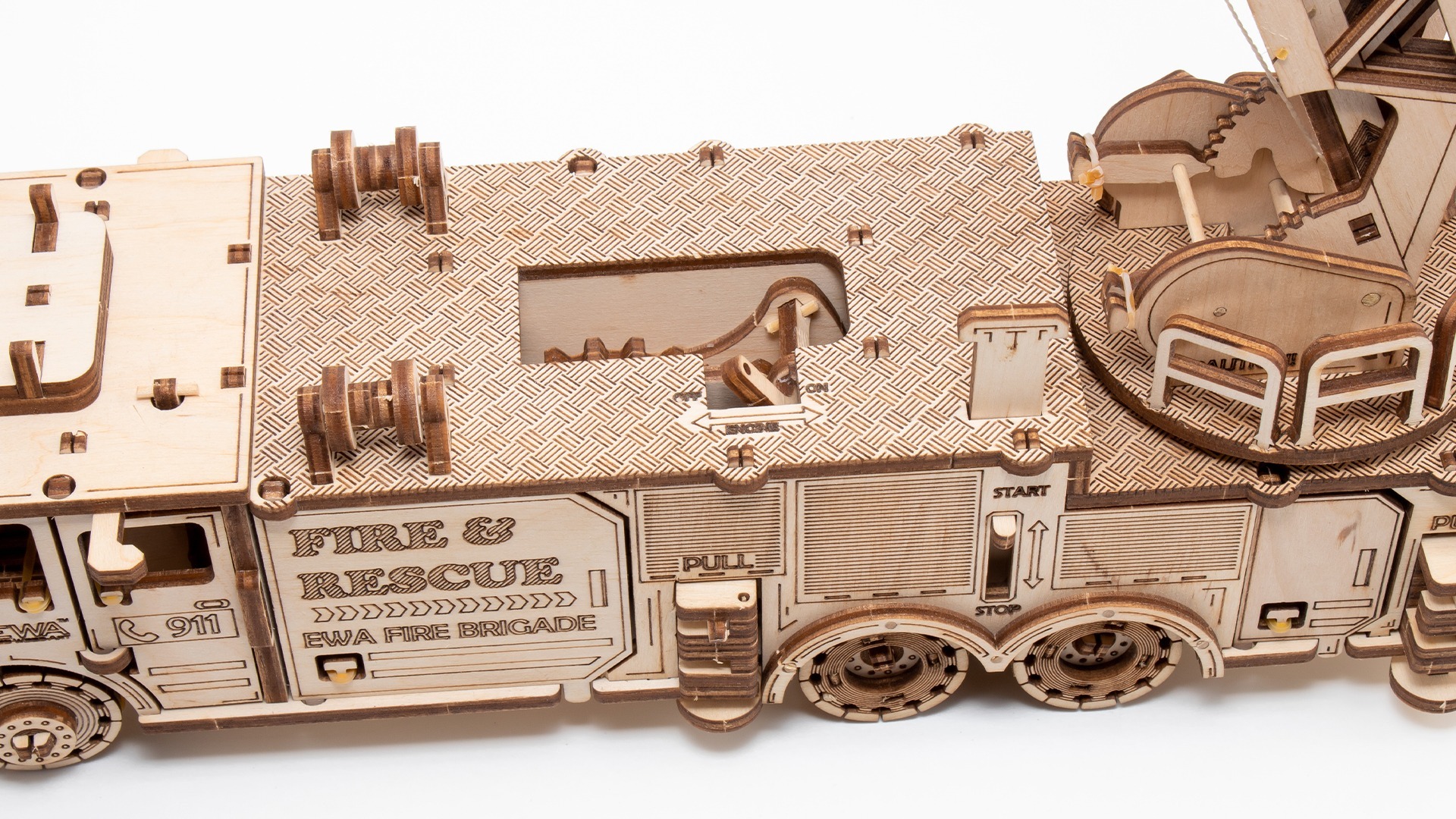 Механический 3D-пазл «Пожарная Машина» для самостоятельной сборки. Модель с заводным механизмом на резинке с ключом, выдвижной и вращающейся пожарной лестницей, вращающимися передними колесами и открывающимися передними дверями, а также выдвижными стопорами для грузовиков. Очень подробная и реалистичная модель настоящей пожарной машины, используемой в реальной жизни для борьбы с огнем и для спасения жизней!