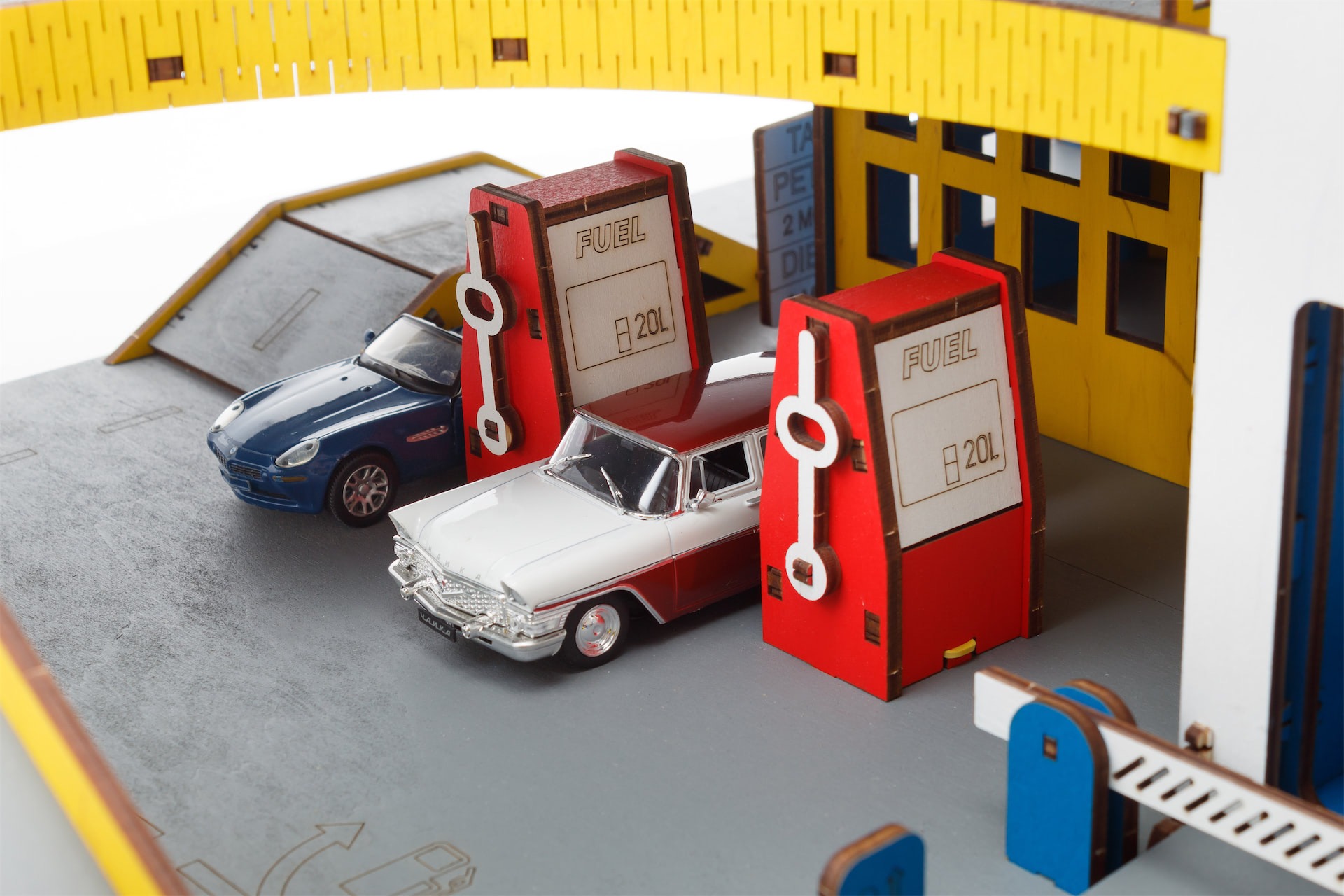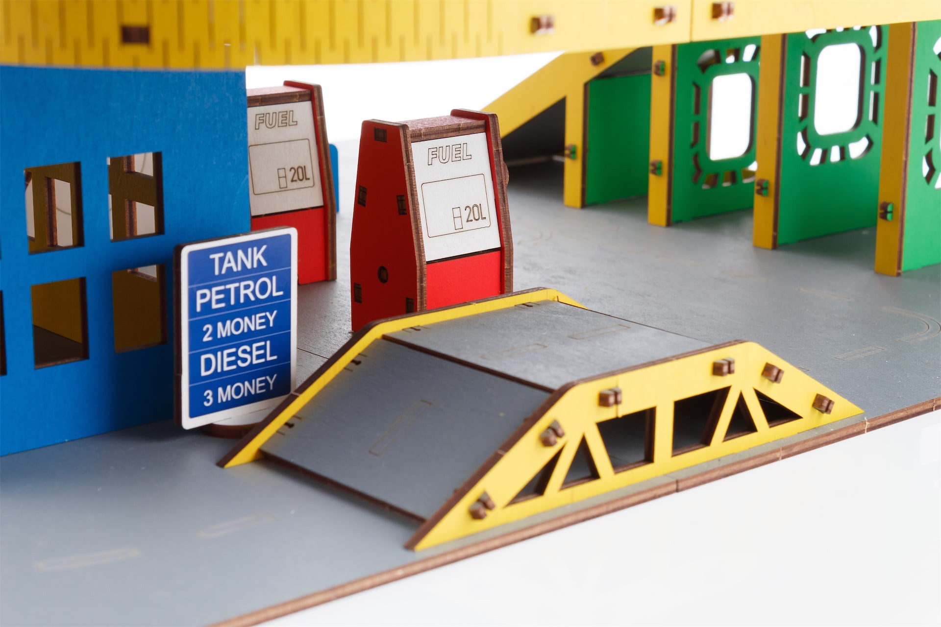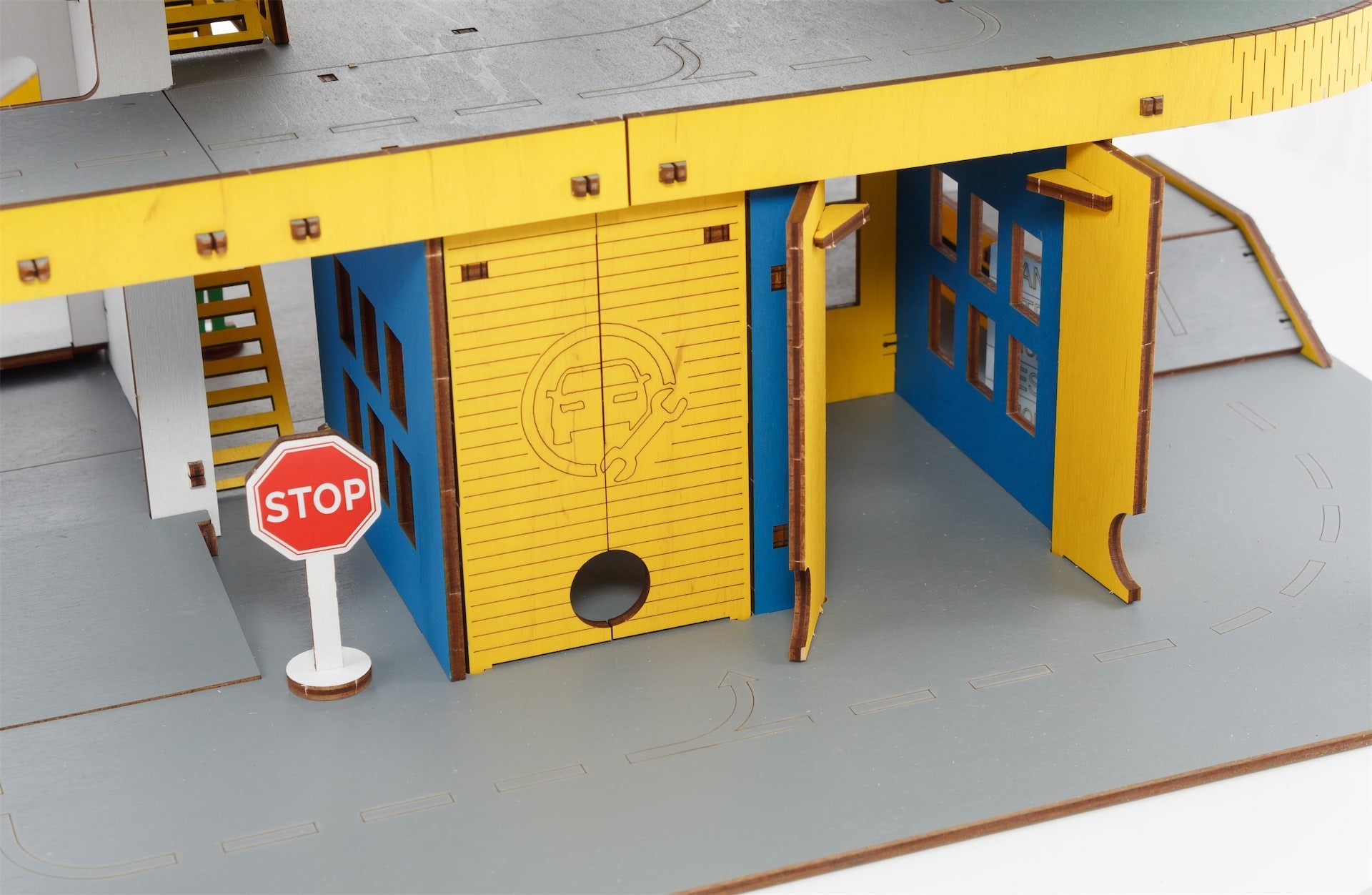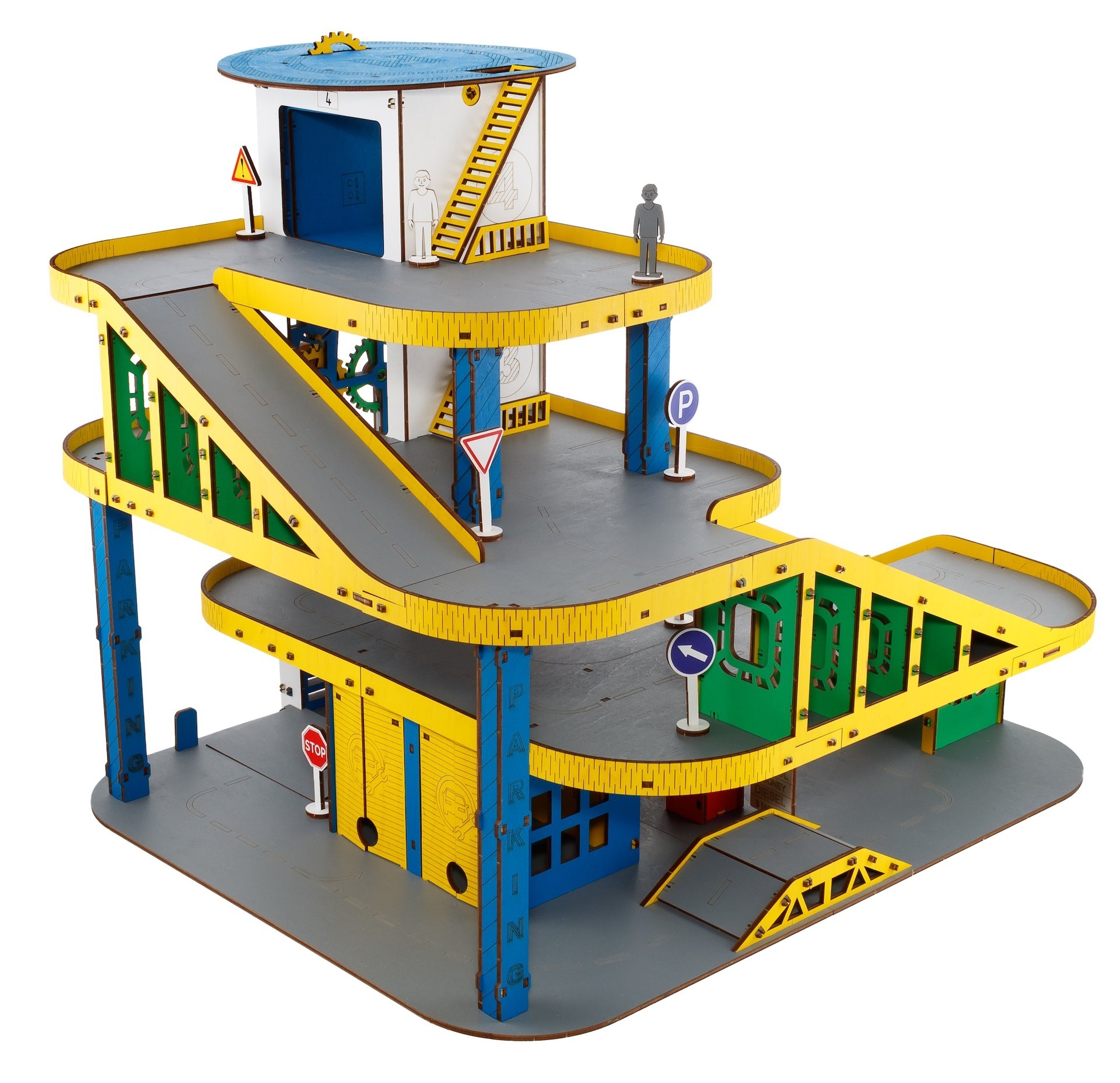 В комплекте с паркингом поставляются дорожные знаки и человечки парковщики. А также есть парковочные места, лифт, заправка, гараж и даже вертолетная площадка. Это позволит ребенку создать разнообразные сценарии игры, развивая при этом свою фантазию и творческие способности.
