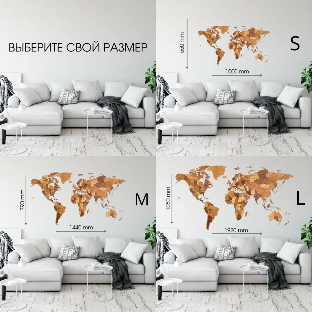 Трехслойная подвесная карта мира от EWA Eco-Wood-Art для самостоятельной сборки. Сборка производится с помощью клея. Крепление к стене можно выполнить с помощью двустороннего скотча. К пазлу и инструкции по сборке прилагается двухсторонний скотч и клей. Поставляется в 3 размерах (S, M, L) и 5 ​​цветах (Blue Fantasy, Untouched World, Emerald Planet, Smoky Dreams, Choco World) по запросу.