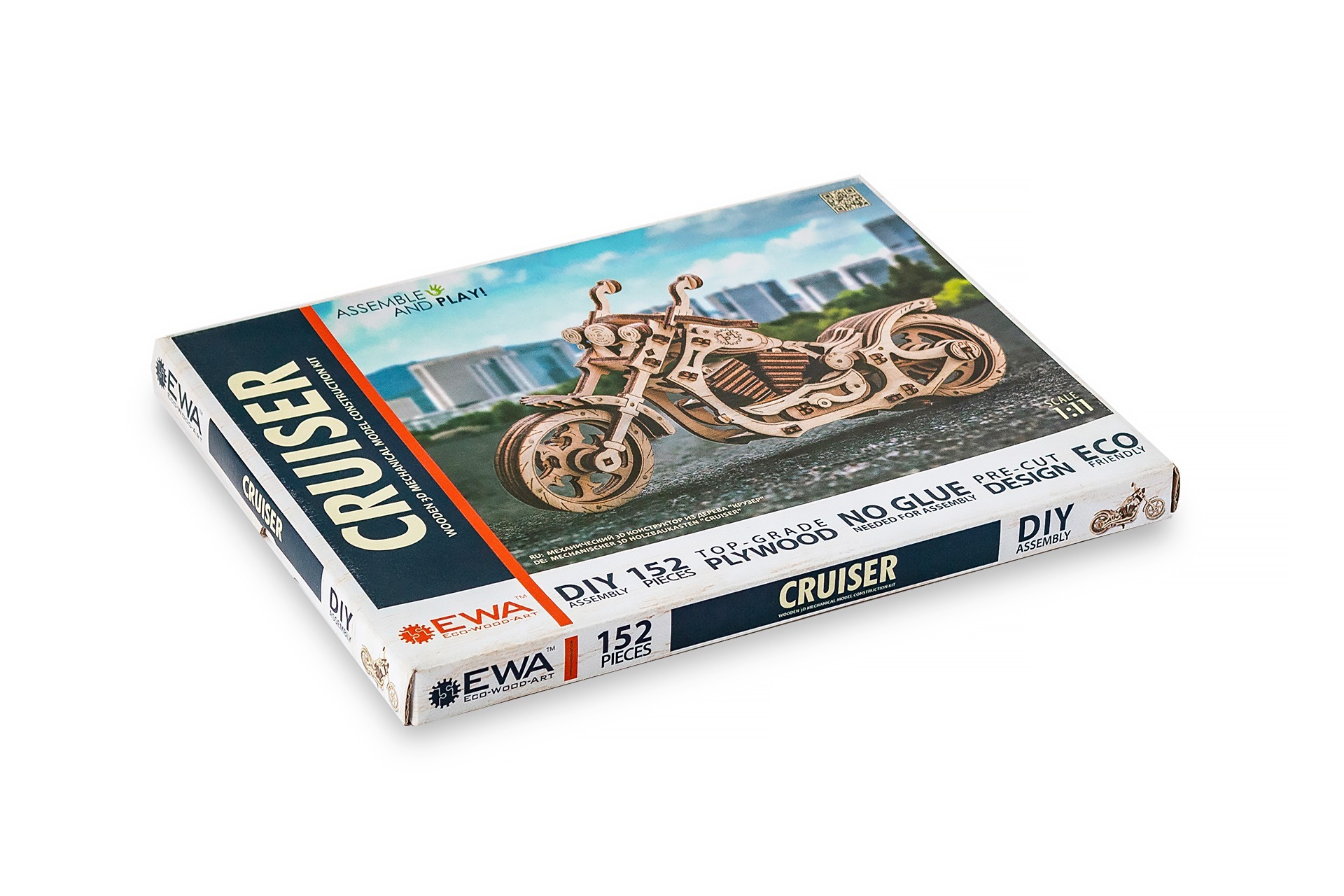 Конструктор, сборная механическая модель мотоцикла с простым и надежным механизмом заводки — отведи и отпусти! Оригинальный дизайн, особый стиль, динамика езды, скорость, поворотный руль, устойчивость, небольшие размеры и натуральные материалы никого не оставят равнодушным! Байк притягивает взгляды и отлично вписывается в любой интерьер, достоин дорогой коллекции и легко превращается в обычную игрушку. Крузер может стать подарком, элементом декора или наградой за победу в любом динамичном состязании детей или взрослых!