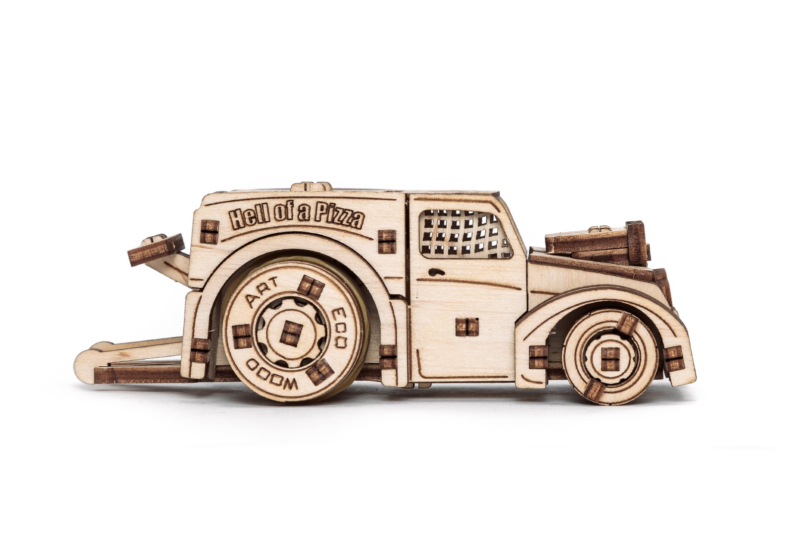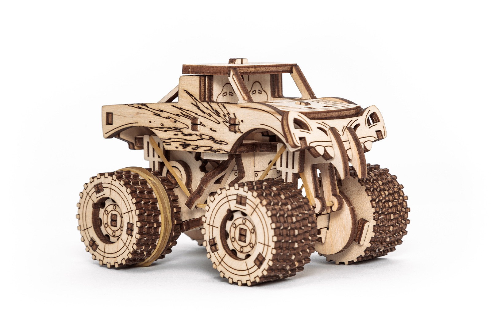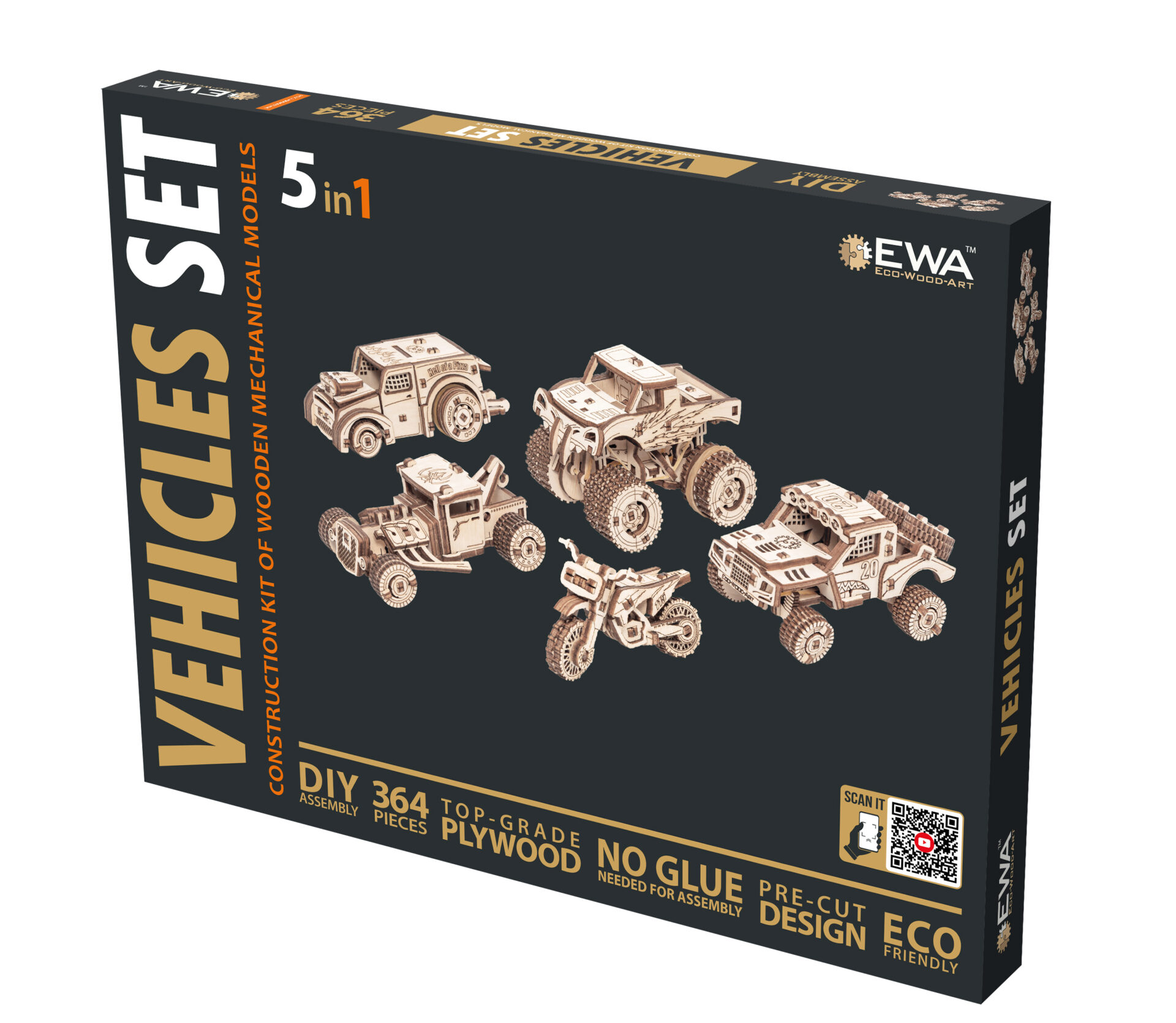 Набор деревянных механических паззлов 5 в 1 представленный маленькими моделями машинок. Набор включает в себя Hot Rod, Monster Truck, Prerunner, Dragster и Cross Bike.