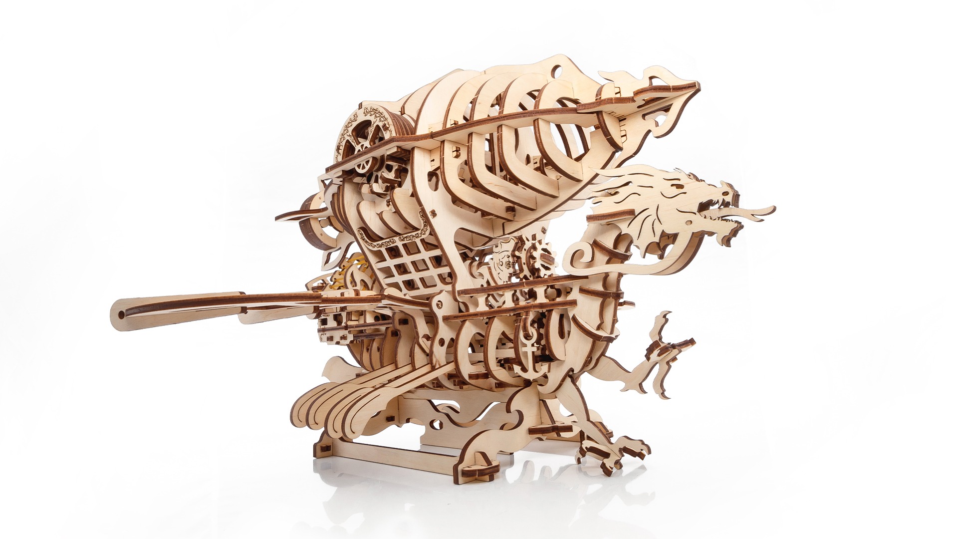 Механическая модель пиратского дирижабля в виде конструктора — Скайлорд! Модель оснащена резиномотором, движущимися крыльями, задним пропеллером и вращающимися лопастями. Устрашающая фигура Дракона на носу и суровый пиратский капитан на палубе определенно заставят ваших врагов трепетать!
